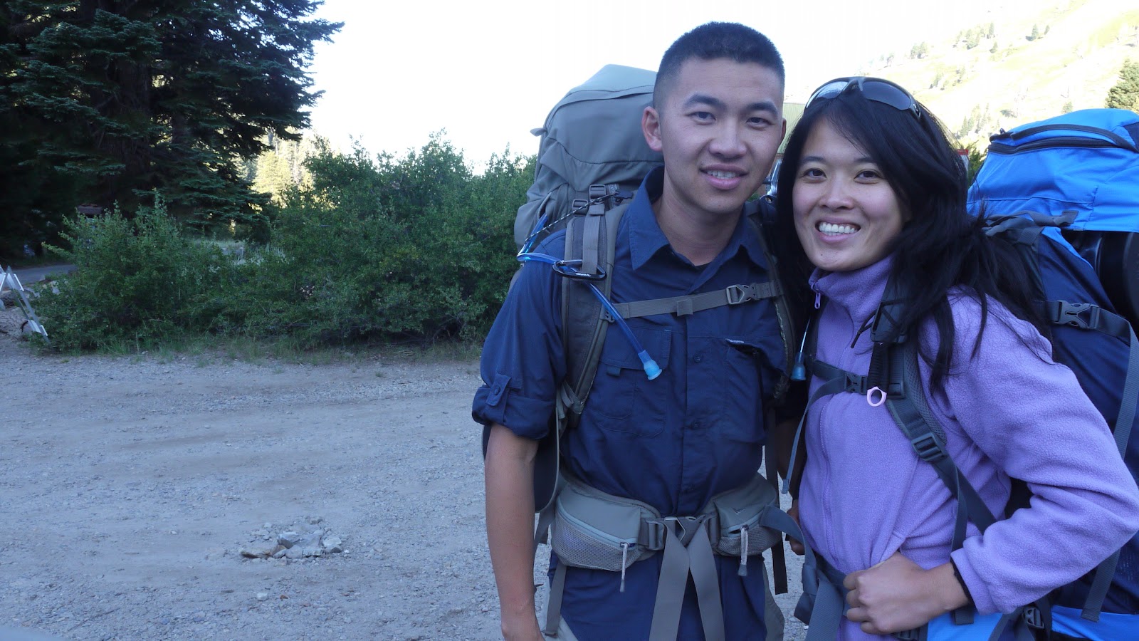 We arrived at trail head at 7AM in the morning waiting for the ranger’s office to open. Even though we made reservations for our permit, we still had to be at the ranger’s office when they opened to receive our permit. The rangers start giving away the permits to others without reservations. We drove to a designated parking lot once we received our permits. Marmots are prevalent around the area, we’ve heard horror stories of these animals climbing under the car and having a field day chewing on car wires. I was a little worried about my Protege, but in the end the Marmots stayed away. Below is a photo of us at the parking lot getting ready for our hike to Monarch Lakes. The elevation at the trail head was about 7800 feet.