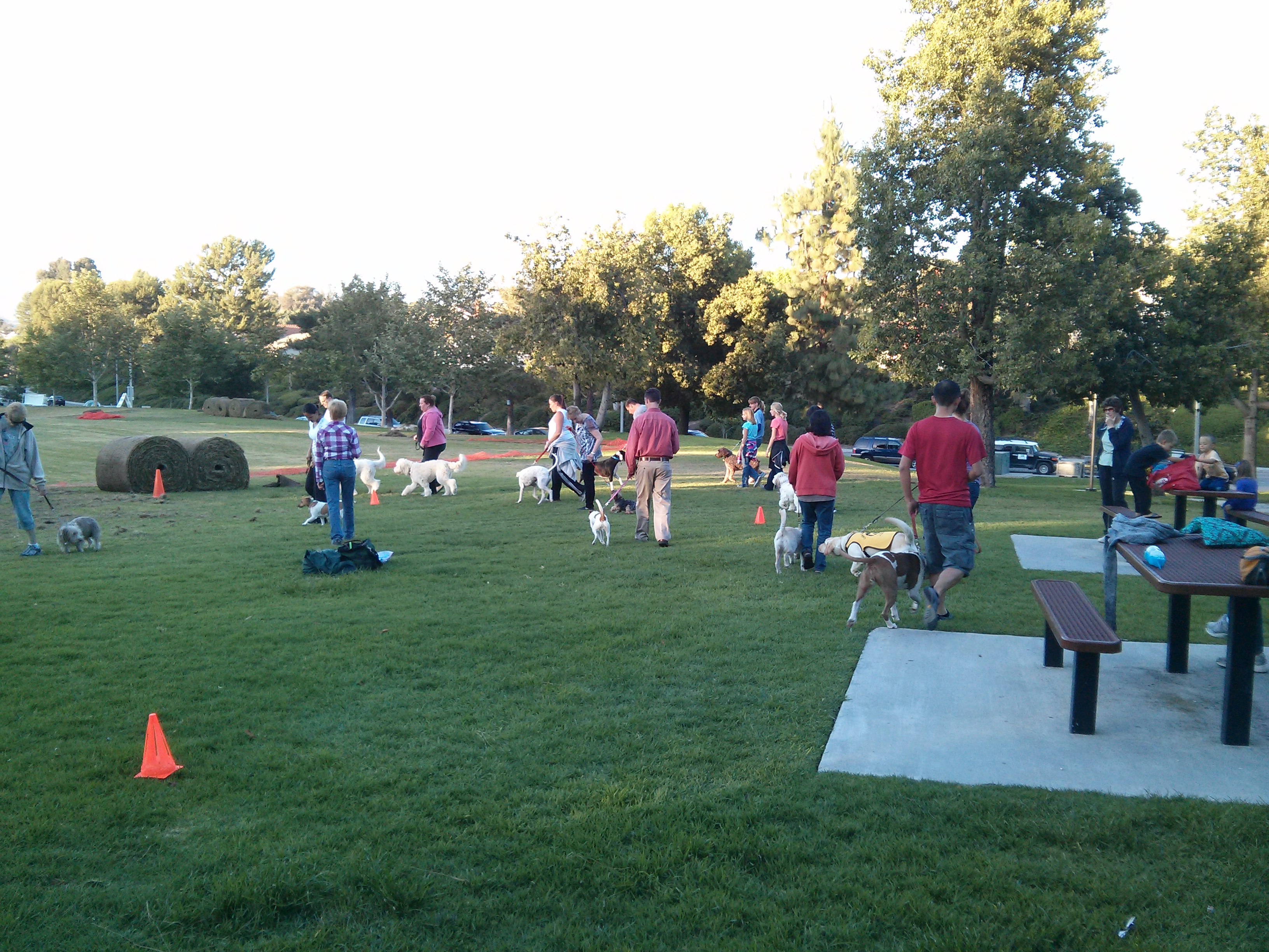 Week 1: Louis and I attended the first introductory class last Wednesday without Dakota and were impressed with the trainer’s demonstrating of what we will teach our dog to do during the next several weeks of class. While we are pretty confident Dakota can already do the basic commands in a controlled environment, we are less confident of her obedience skills when she’s surrounded by 14 other dogs. Inspired by the introductory class, we decided to use some of the trainer’s tips while walking Dakota the same night. When we arrived at a part of our neighborhood that is infested with rabbits, Dakota immediately went into hunting mode, ears up, upright, ready to pounce of the rabbits. As usual, she follows through with her sit command very well but never makes eye contact with us. She is constantly scanning the area, shaking with anxiety and whimpering, begging to go after the rabbits. Louis decided to use his hands to turn Dakota’s face toward us, hoping she would make eye contact. After a bit of chastising, yelling and struggling, she finally made eye contact. We were amazing at how much calmer she is after acknowledging through eye contact and we were glad we took the trainer’s recommendation and followed through with the exercise instead of giving up half way through. It’s been a week since we tried the exercise, we still cannot get Dakota to voluntary turn her head to make eye contact with us but our hand gesture to turn her head requires a lot less effort. A short list of things we hope to get out of the obedience class: