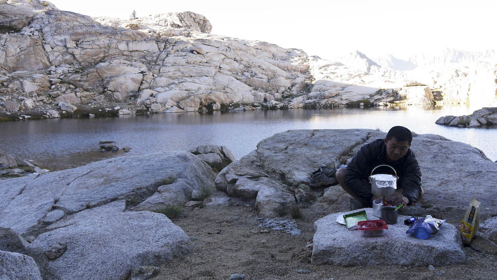 We arrived at Pinto “Lake” in the late afternoon. I say lake with quotes because it was really just a stagnant pond. Do not expect much. We chose great campsites close to Cliff Creek just on the other side of trail. Watching the sunset against the rock cliff was a pretty sweet way to end our first day in the high sierras.