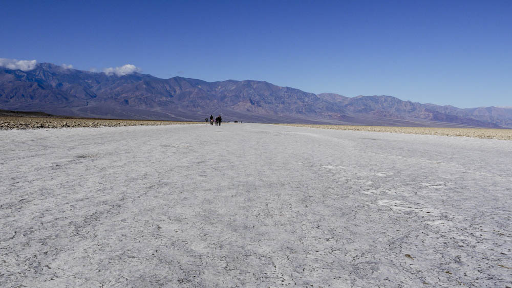 Good to know: We thought the food at the 49ers restaurant was low quality and overpriced. It’s a much better idea to prepare your own meal at the campsite. On our first full day at Death Valley National Park, we decided to visit Badwater Basin, Natural Bridge Canyon, Artist Drive, Red Cathedral and Mesquite Flats Sand Dunes. After a quick stop by the ranger station, we headed out to Badwater Basin. The drive to Badwater Basin from the Furnace Creek ranger station is about 17 miles and is the lowest spot in North America, with an elevation of 282 ft below sea level. You can hike as far as 5 miles out in the salt flats but the view is more or less the same.