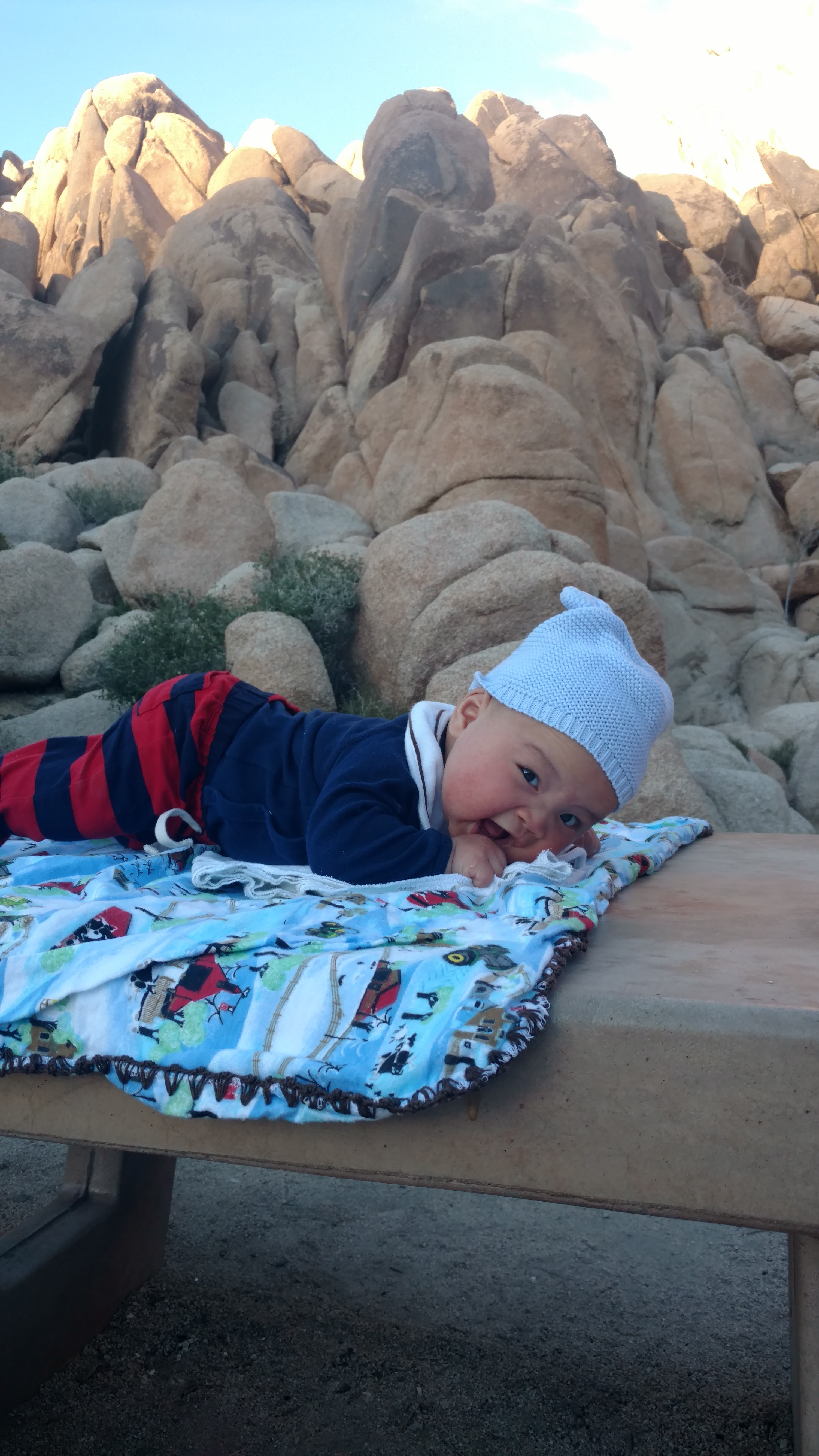 IMG_20170307_164831067 Published April 17, 2017 at 3006 × 5344 in Day 4- Joshua Tree National Park – Indian Rock Campground and Boy Scout Trail Tummy time at the picnic table