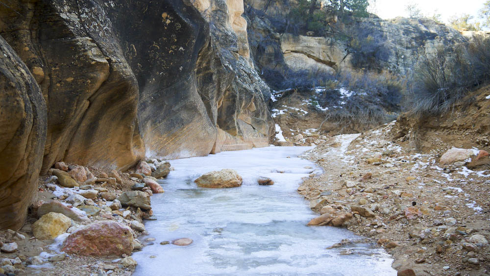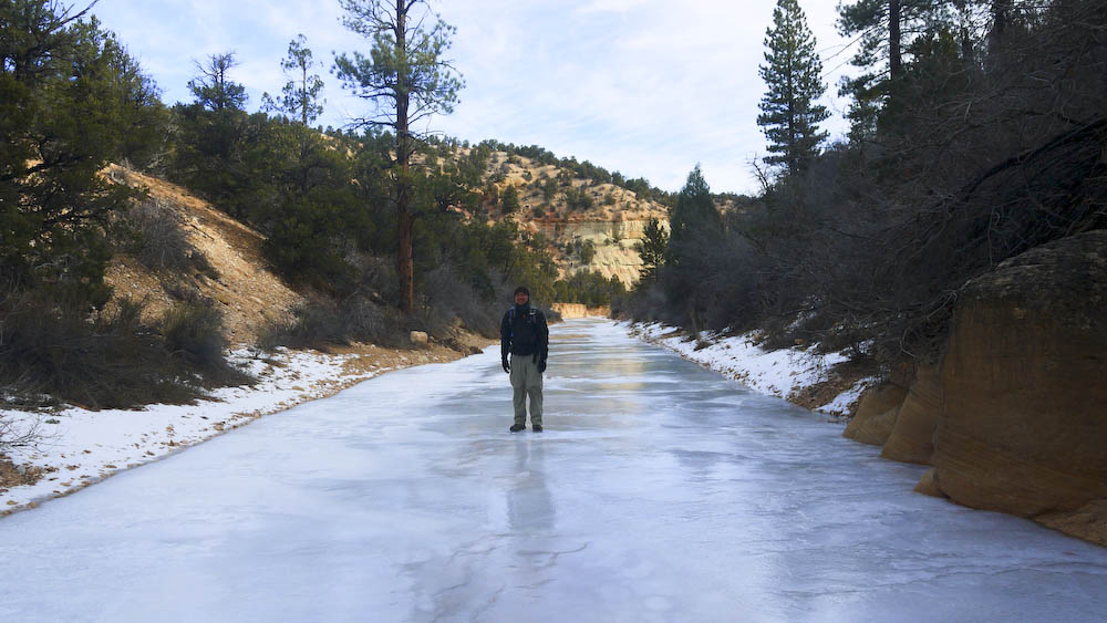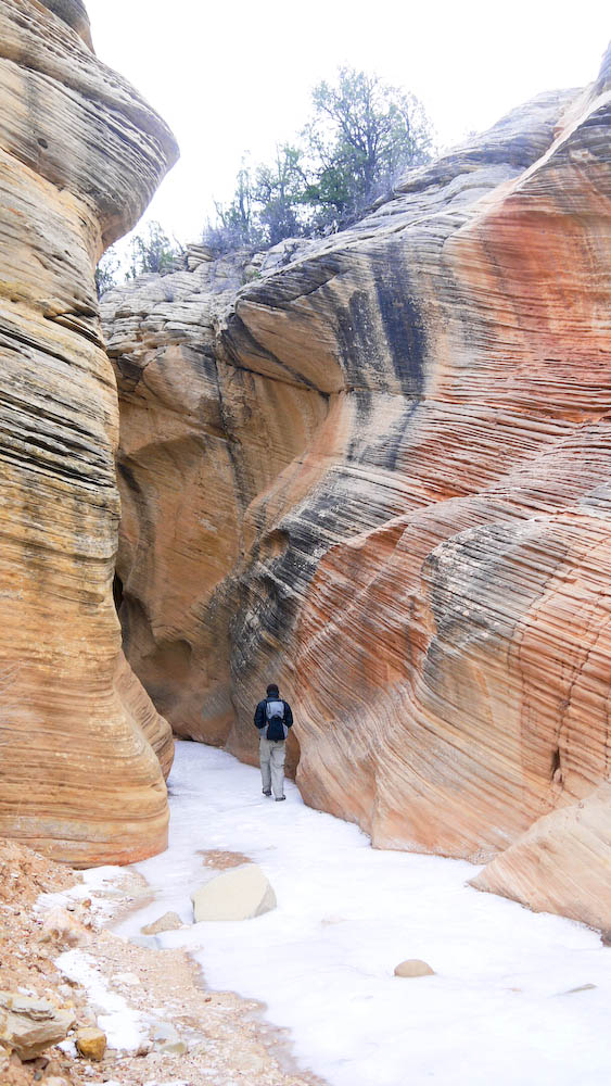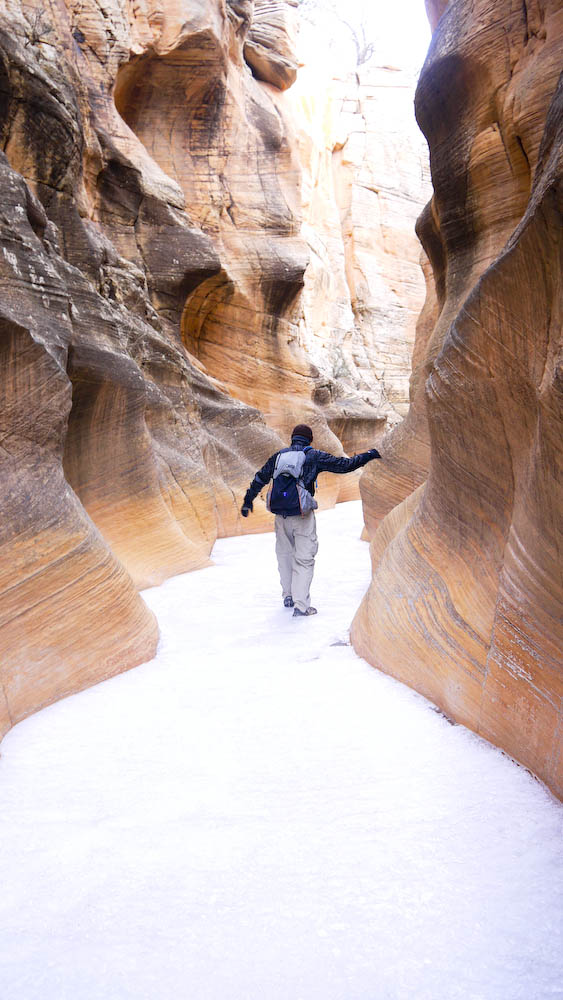 We got to the trail head around 11AM. It was a beautiful sunny day and the water in the slot canyon was still frozen at the start of our hike.